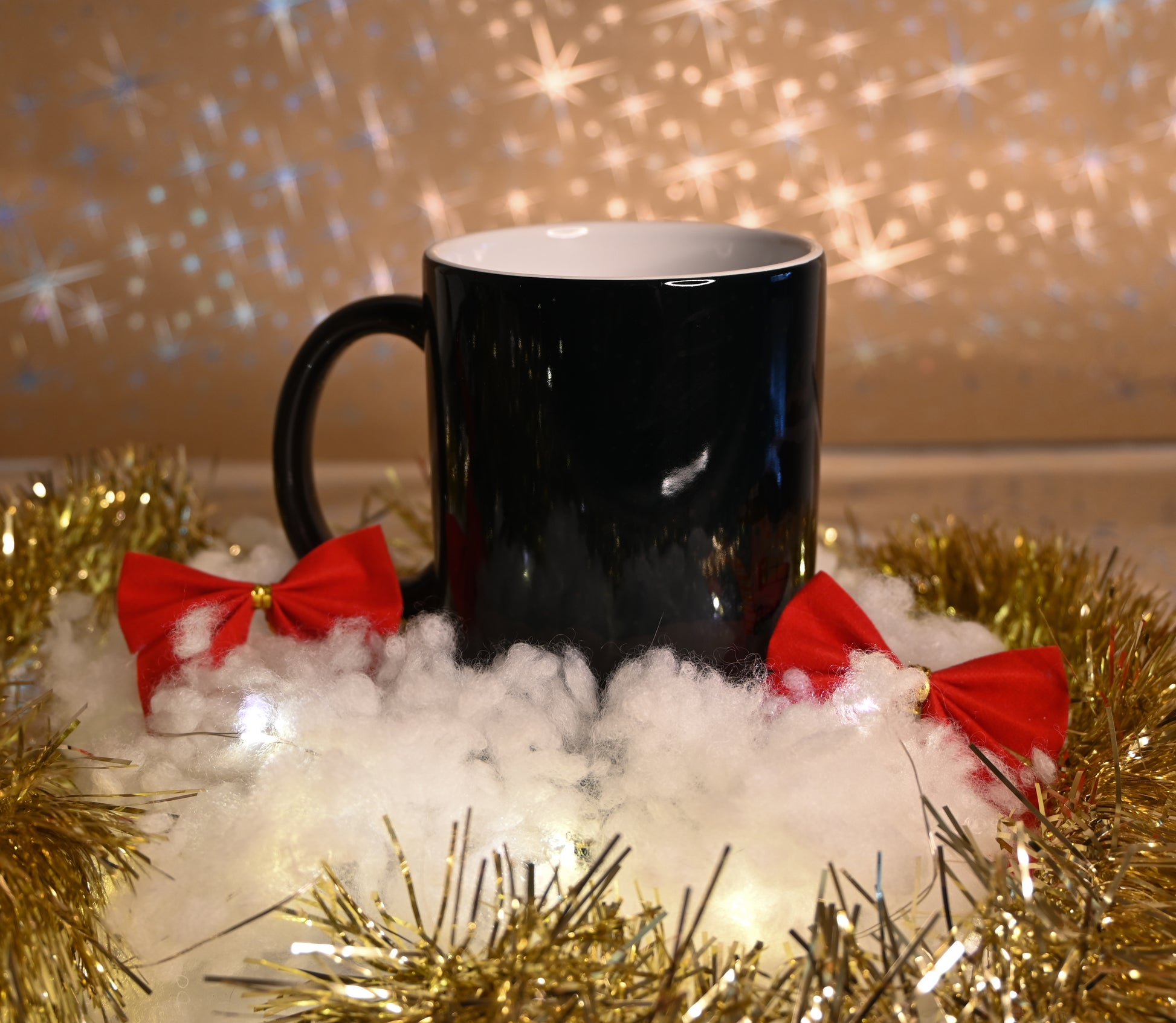This mug has a black glossy finish when it's empty. When a hot beverage is added, the mug reveals your beautiful artwork. Perfect for your morning coffee, a hot chocolate, or any other hot beverage you enjoy. The mug is not microwave and dishwasher safe.
